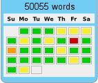 I officially crossed the finish line today – 50055 words! Looking back over the month, there was only 1 day that I didn’t do any writing at all (that big red square). I hit my writing goal or better on all of the green days.