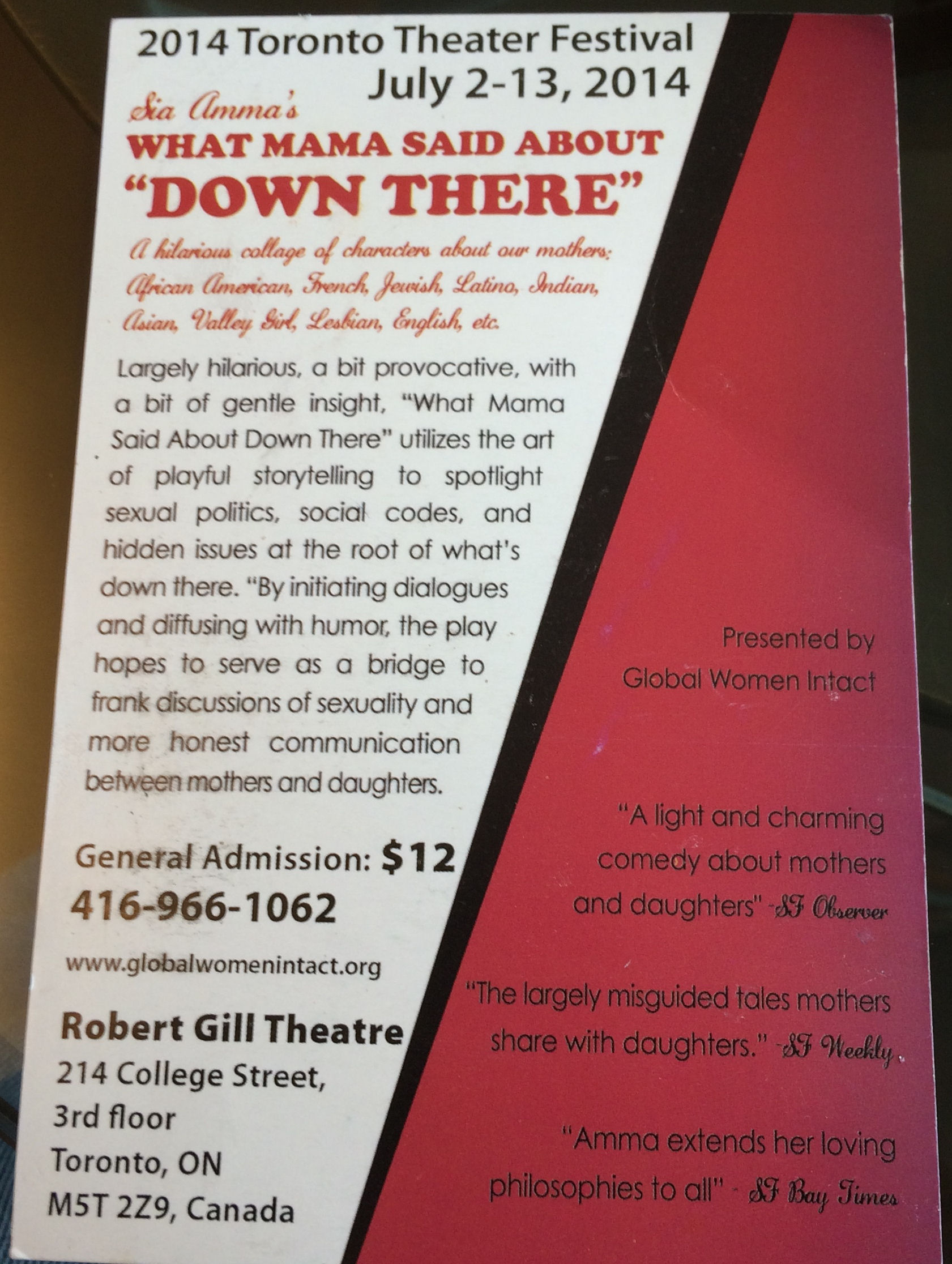 What Mama Said About Down There is a one woman show performed by Sia Amma about what mothers tell their daughters about that mysterious place guarded by strong, unyielding granny panties (if you are a good girl).